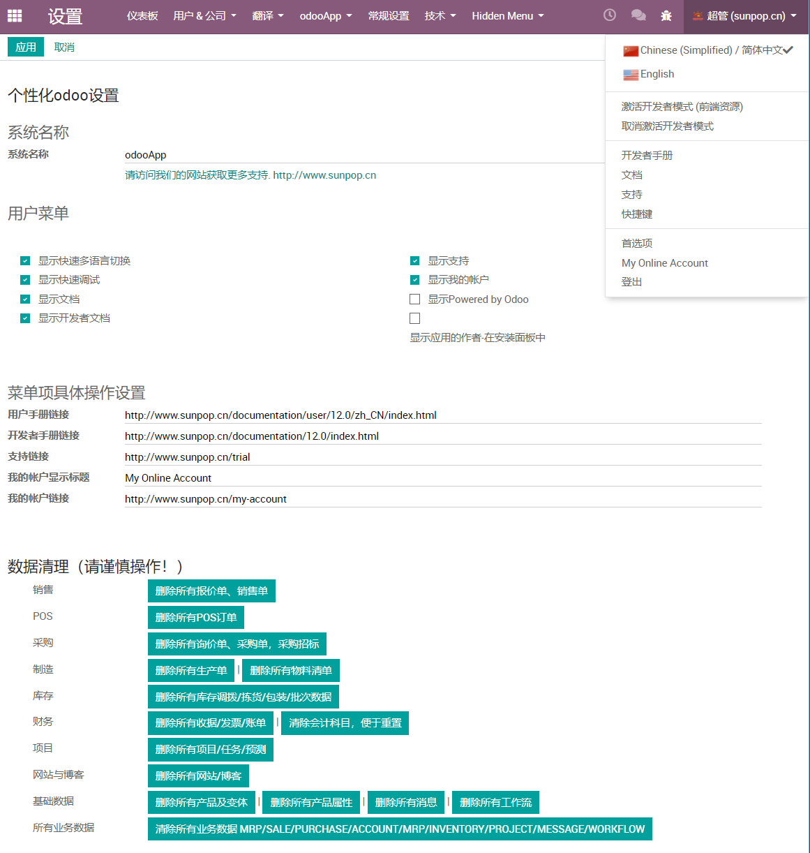 This moduld allows user to quickly customize and debranding Odoo. Quick debug, Language Switcher, Online Documentation Access,Quick Data Clear.