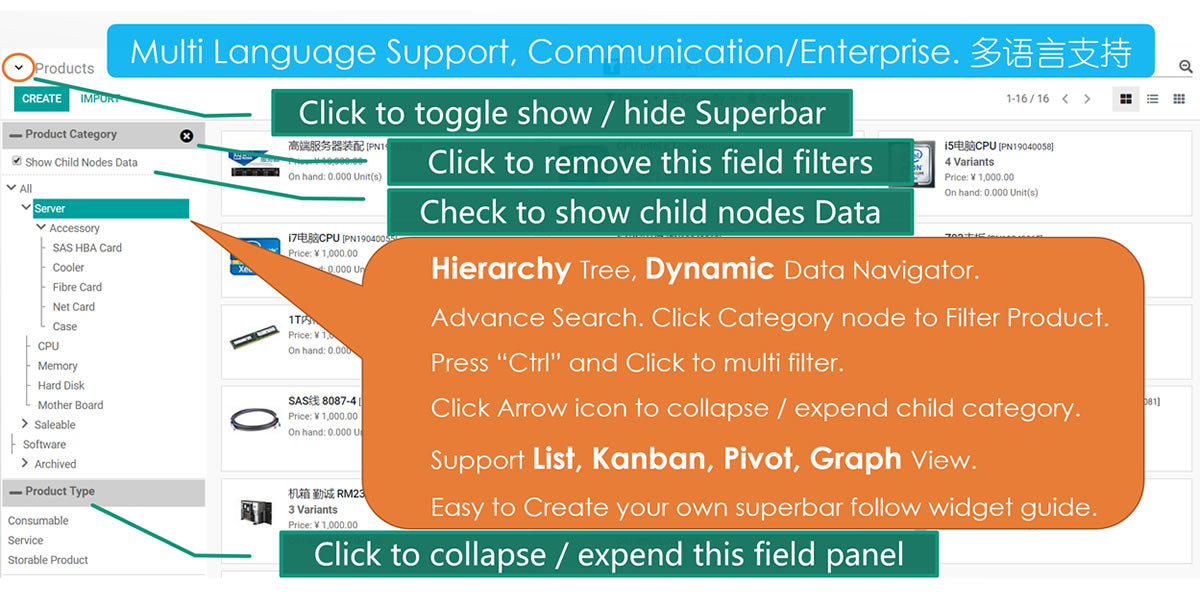 • Easy to show parent children tree for tree, kanban, pivot, graph view.(Note that there would be little different in UI between odoo12,11,10)