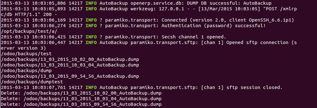 Want to go even further and write your backups to an external server? You can with this module! Specify the credentials to the server, specify a path and everything will be backed up automatically. This is done through an SSH (encrypted) tunnel, thanks to pysftp, so your data is safe!