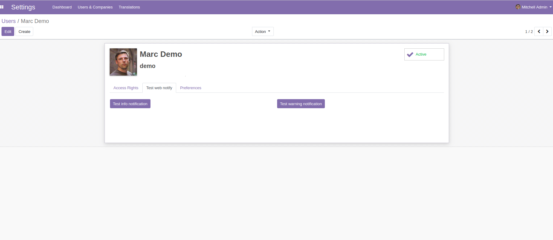 Add self-test buttons in demo environment, Updated readme to show how to test it. Add buttons to users form Do not rely on SUPERUSER_ID and avoid getattr usage